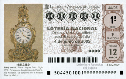 Reloj mural. Pierre Jaquet Droz. Siglo XVIII. Pertenece a la colección de Patrimonio Nacional. Se conserva en el Palacio Real de Madrid. Relojes, 4 de junio de 2005. |