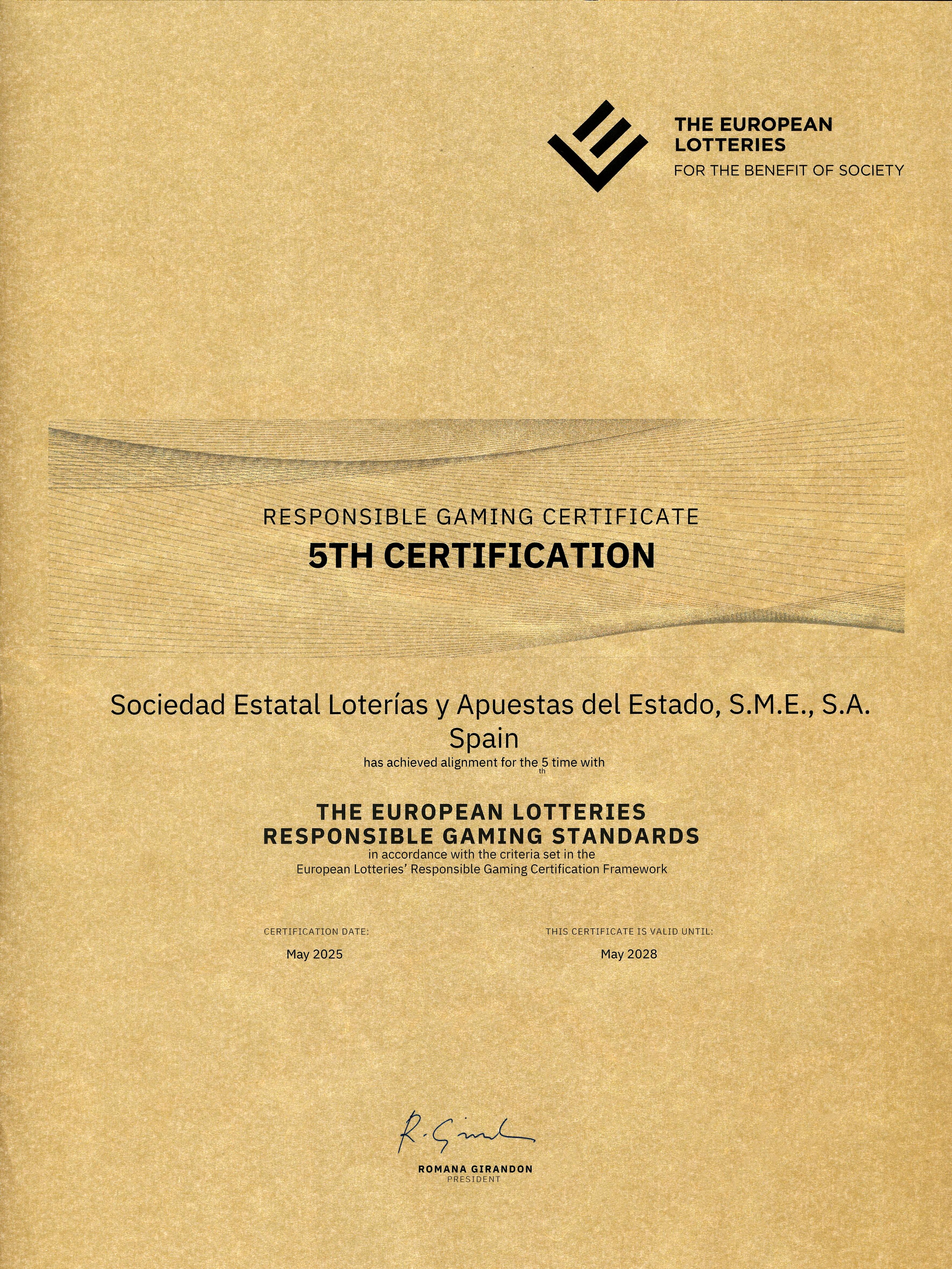 El compromís de Loteries amb el joc responsable és una peça clau de la seva Responsabilitat Social Corporativa i de la seva activitat, manifestat a través de la implantació rigorosa de les millors pràctiques de Joc Responsable a Loteries. Des del 2013, Loteries ha mantingut la certificació en l’estàndard de bones pràctiques de Joc Responsable de l’Associació de Loteries Europees (European Lotteries, EL).